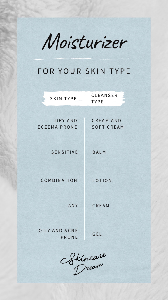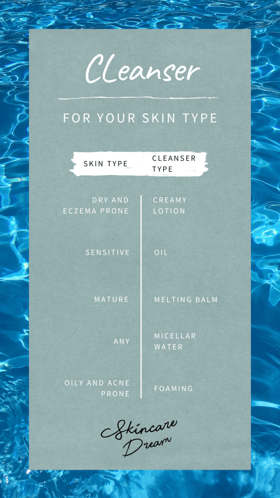 After you established your skin type you can choose a cleanser suitable for you. Cleansers remove dirt, oil, bacteria and excess sebum from your face. It should be the first thing you do in the morning to get rid of all those things and the creams you used the day before. It also helps your moisturizer to maximize its benefits.